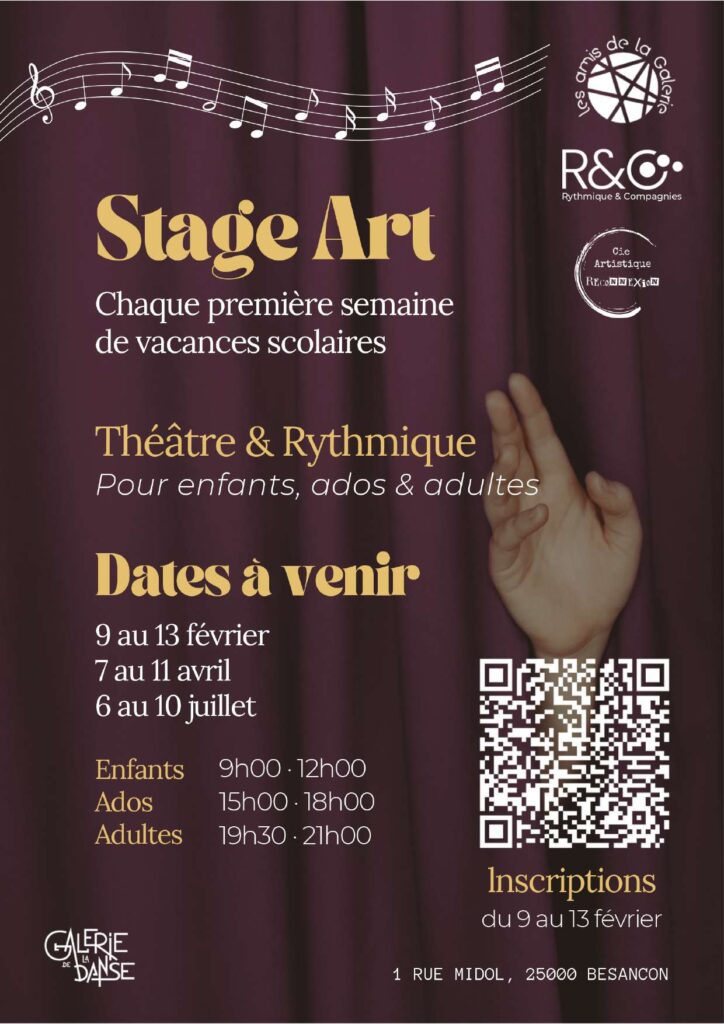 Ce stage pluridisciplinaire associe théâtre, danse contemporaine et danse rythmique, offrant aux participants un espace de création, d’expression et de recherche corporelle.