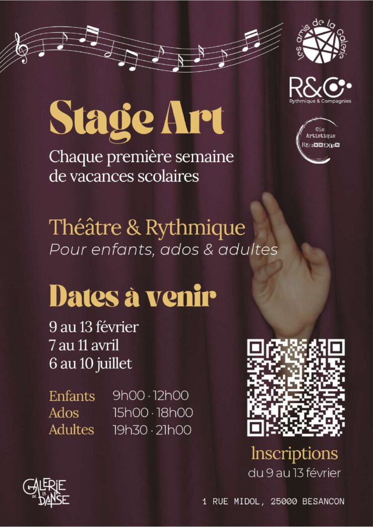09 > 13Fév2026 Stage ART Février L’association les amis de la galerie vous propose un stage ART la première semaine de vacances scolaires autour d’un thème artistique renouvelé ! Ce stage pluridisciplinaire associe théâtre, danse contemporaine et danse rythmique, offrant aux participants un espace de création, d’expression et de recherche corporelle.Il favorise l’imaginaire, la confiance en soi et le travail collectif, ...